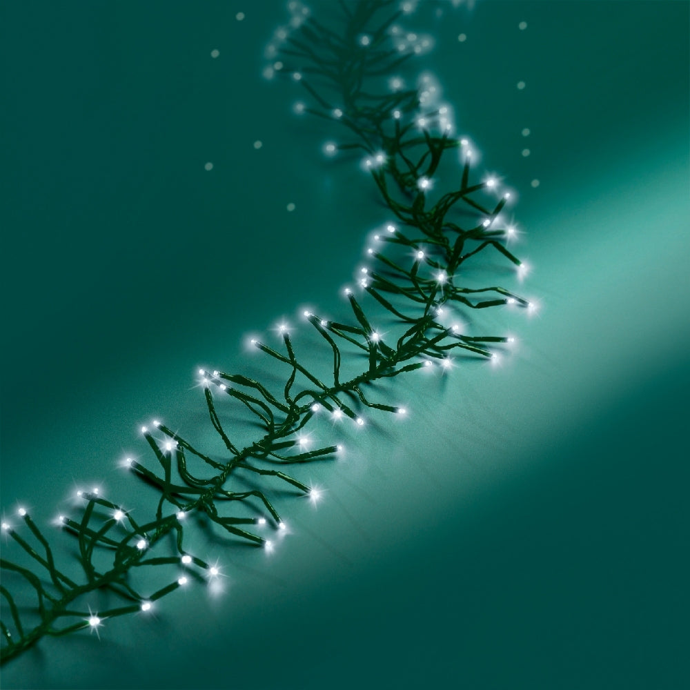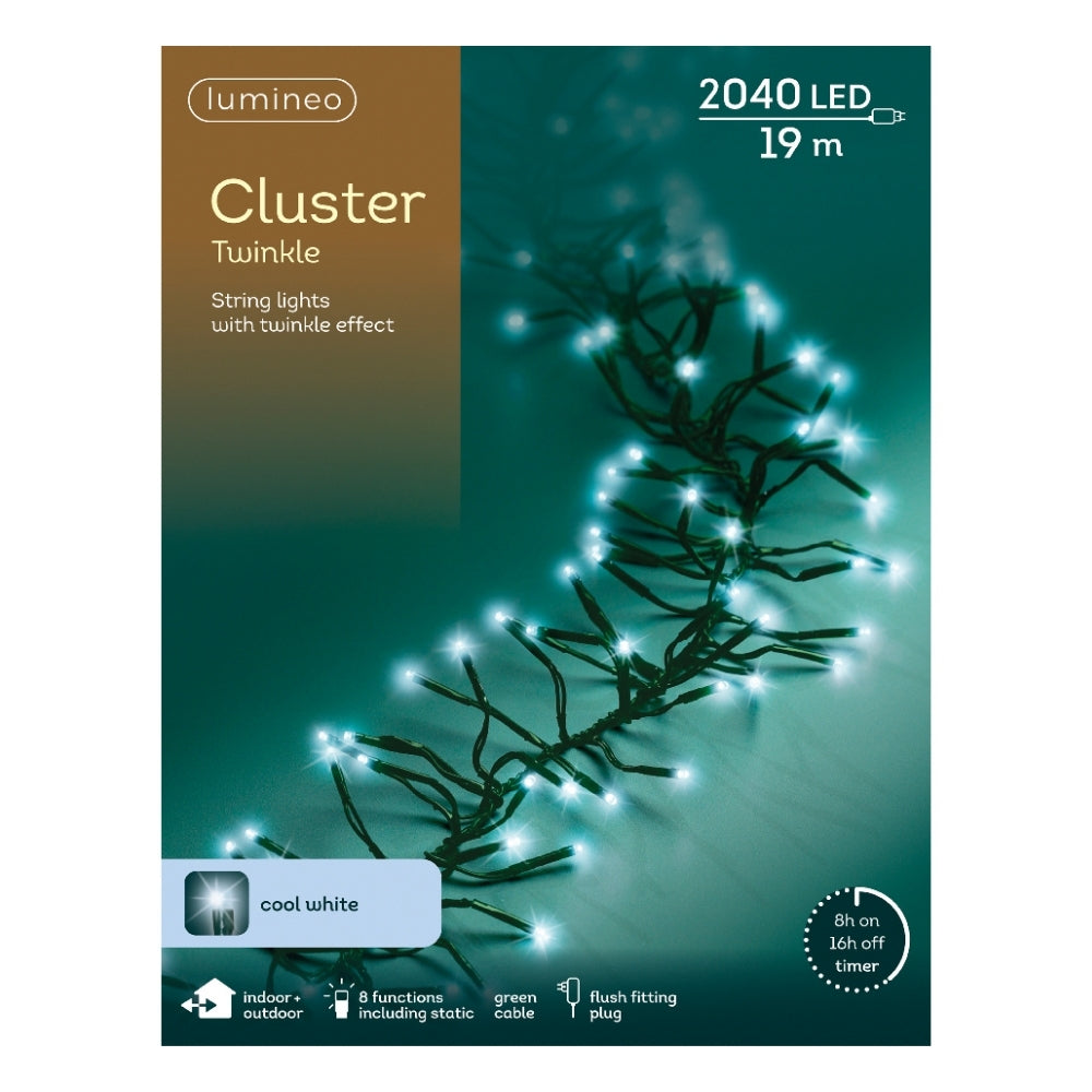 Add an icy sparkle to your outdoor Christmas display with these 2040 Cool White Cluster Lights. Perfect for long hedges, rooflines, or large trees, their 17m lit length and 8 twinkle effects create an eye-catching, wintry ambience. The robust IP-44 rating and 8m lead cable make them ideal for reliable, weather-resistant use all season long.