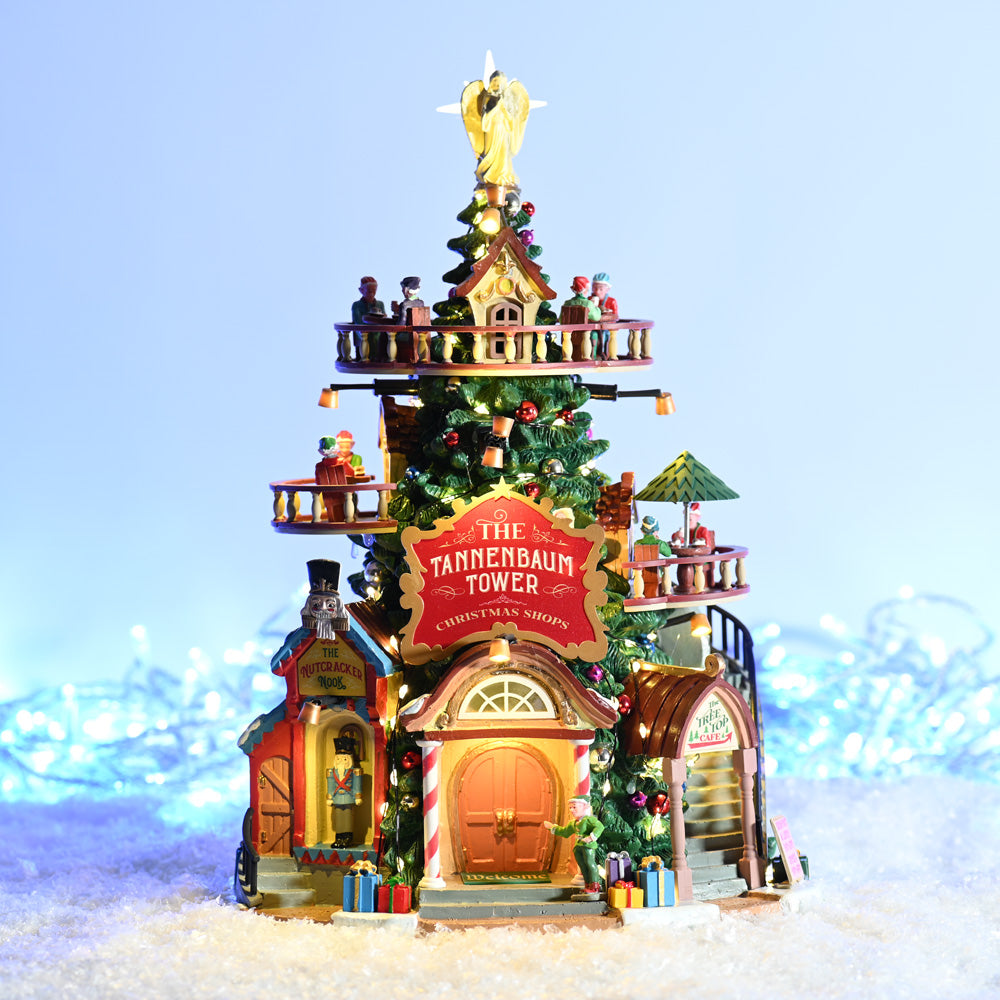 The Tannenbaum Tower Christmas Shops is a magical addition to Santa’s Wonderland, shaped like a towering Christmas tree. Crafted from resin and hand painted with festive flair, the design reveals whimsical boutiques, a Tree Top Café with seasonal treats, and Nutcracker’s Nook—each framed by warm lights and decorations. Built?in LED lighting is operated via a simple on/off switch, while the structure runs on three AA batteries or can be adapted with a Lemax power adaptor (not included). With dimensions of approximately?30.5 x 22 x 20 cm, it brings towering festive wonder without overwhelming your layout. Released in 2025, it adds story?rich charm to any village display.