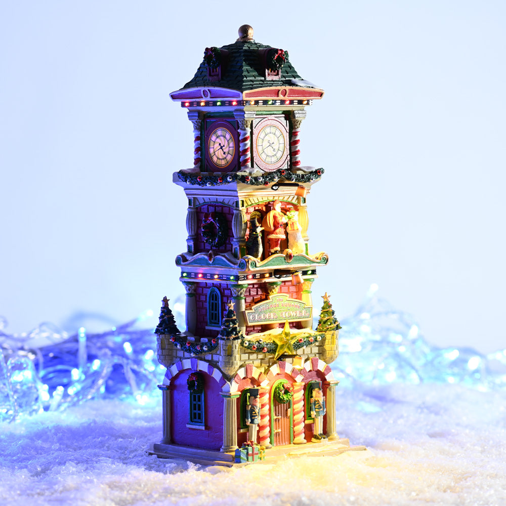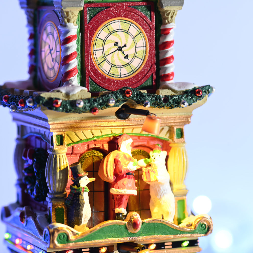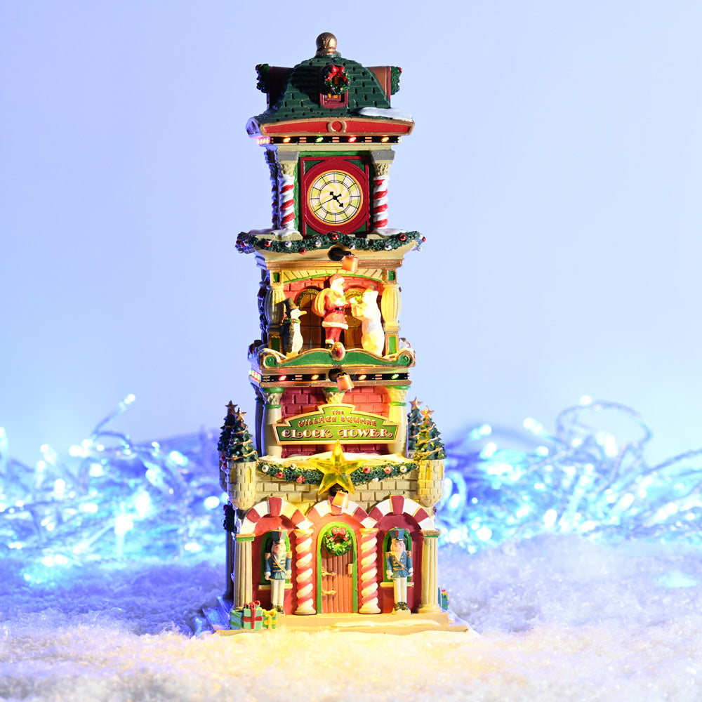 The Village Square Clock Tower stands proudly at the centre of Santa’s Wonderland, sparkling with festive detail. Crafted from resin and hand painted with glistening lights, ornaments, wreaths and holiday décor, it becomes a radiant focal point in any display. The clock chimes in spirit, inviting family and friends to share joyful moments. Built?in LED lighting, controlled with a simple on/off switch, bathes the scene in soft glow. Measuring approximately 28.8 x 13.7 x 11.1?cm, it fits neatly into your layout while making a bold statement. Operates on three AA batteries or can be powered using a Lemax adaptor (not included). Released in 2025 as part of the Santa’s Wonderland collection, it brings magical character to your festive scene.