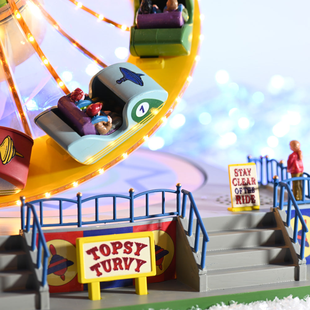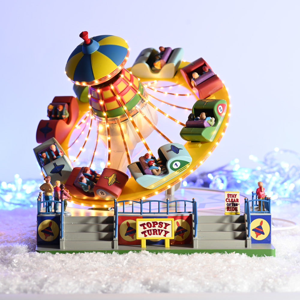 Topsy Turvy brings the thrilling motion of a fairground ride right into your festive setting. Crafted from quality electronic components, this animated piece features brightly coloured cars that spin, rise and fall as joyful carnival music plays. The volume and power switch lets you control the atmosphere—simple and intuitive. Measuring about 20.1 x 25.2 x 31?cm, it’s a dynamic, attention?grabbing centrepiece without overwhelming your display. Released in 2025 as part of the Carnival Sights & Sounds series, it includes an adaptor, offering instant excitement and motion for your village layout.