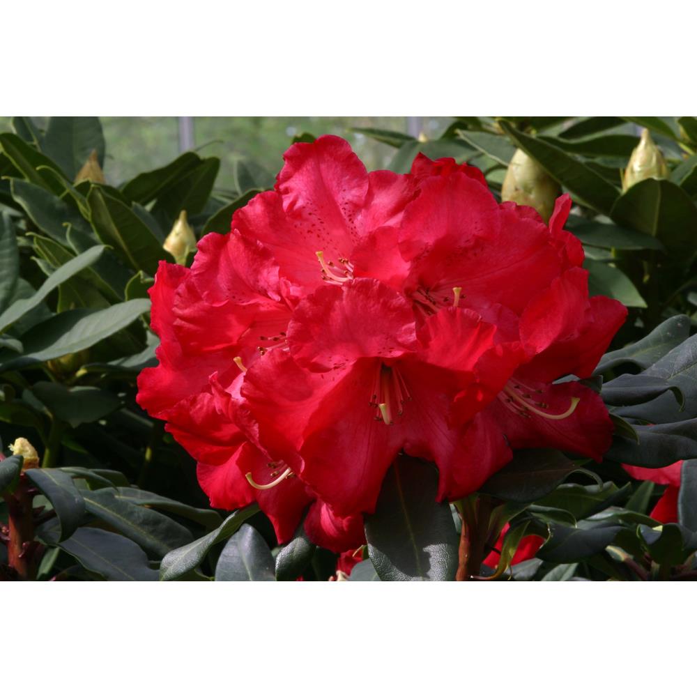 A beautiful rhododendron with striking red flower buds that open to reveal enormous red flowers that have a darker spotting in the centre. In shadier sites these will remain red but fade to pink in the sun. It has an upright habit and dark green thick leaves. Flowers during May.