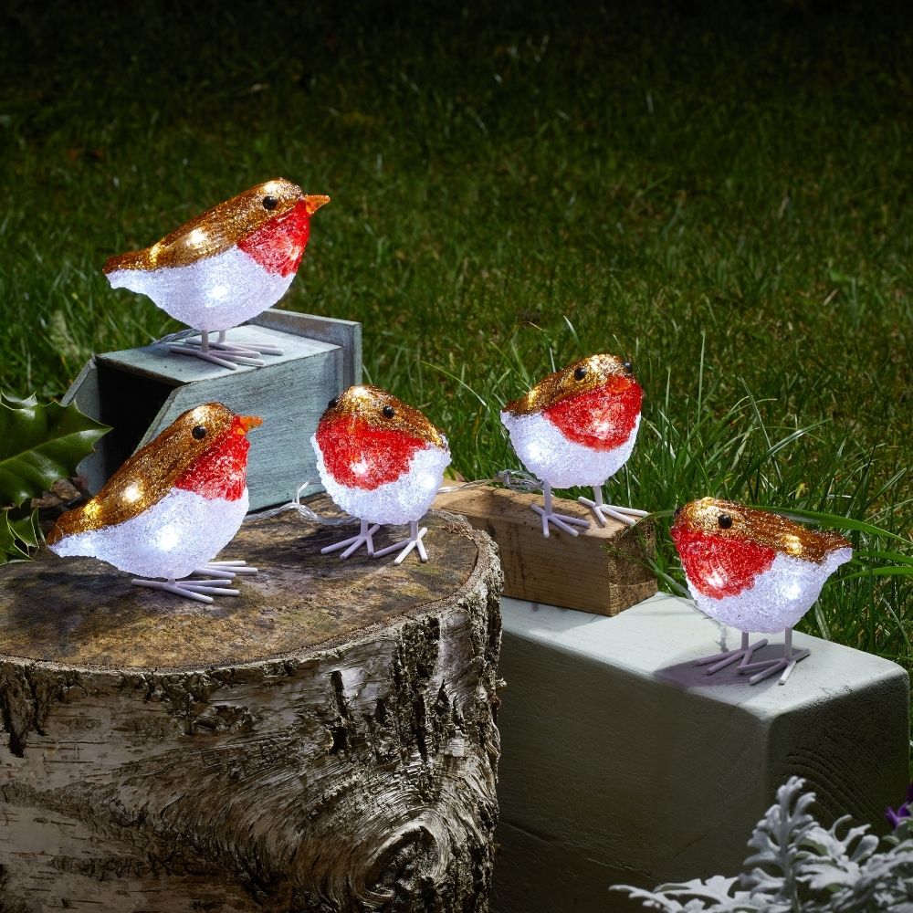 Bring a touch of festive cheer to your garden with the Three Kings Inlit Ice Robins. This charming set of five illuminated robins adds warmth and personality to any outdoor display. Each acrylic figure glows beautifully with built-in LEDs, creating a soft and welcoming light. Perfect for placing around doorways, patios, or winter planters, these robins are durable, weather-resistant, and ideal for spreading Christmas joy year after year.