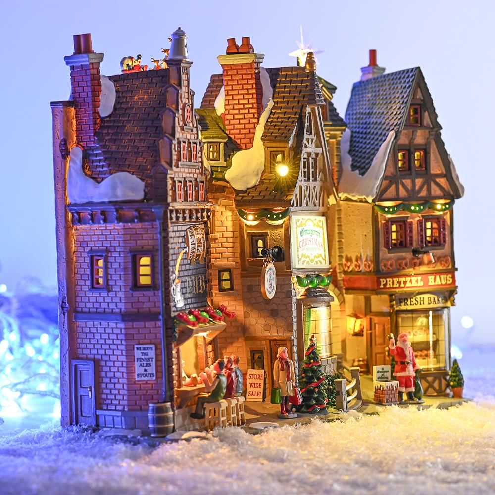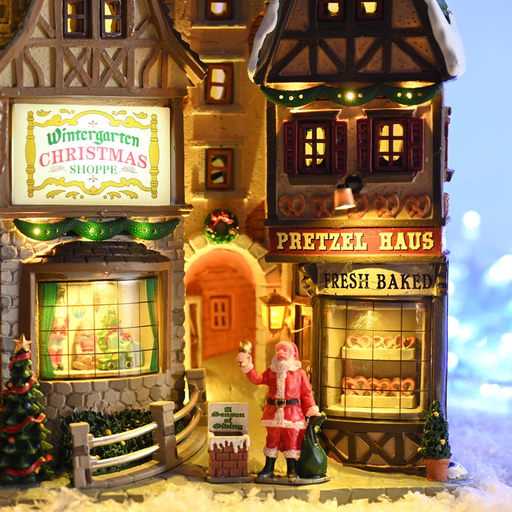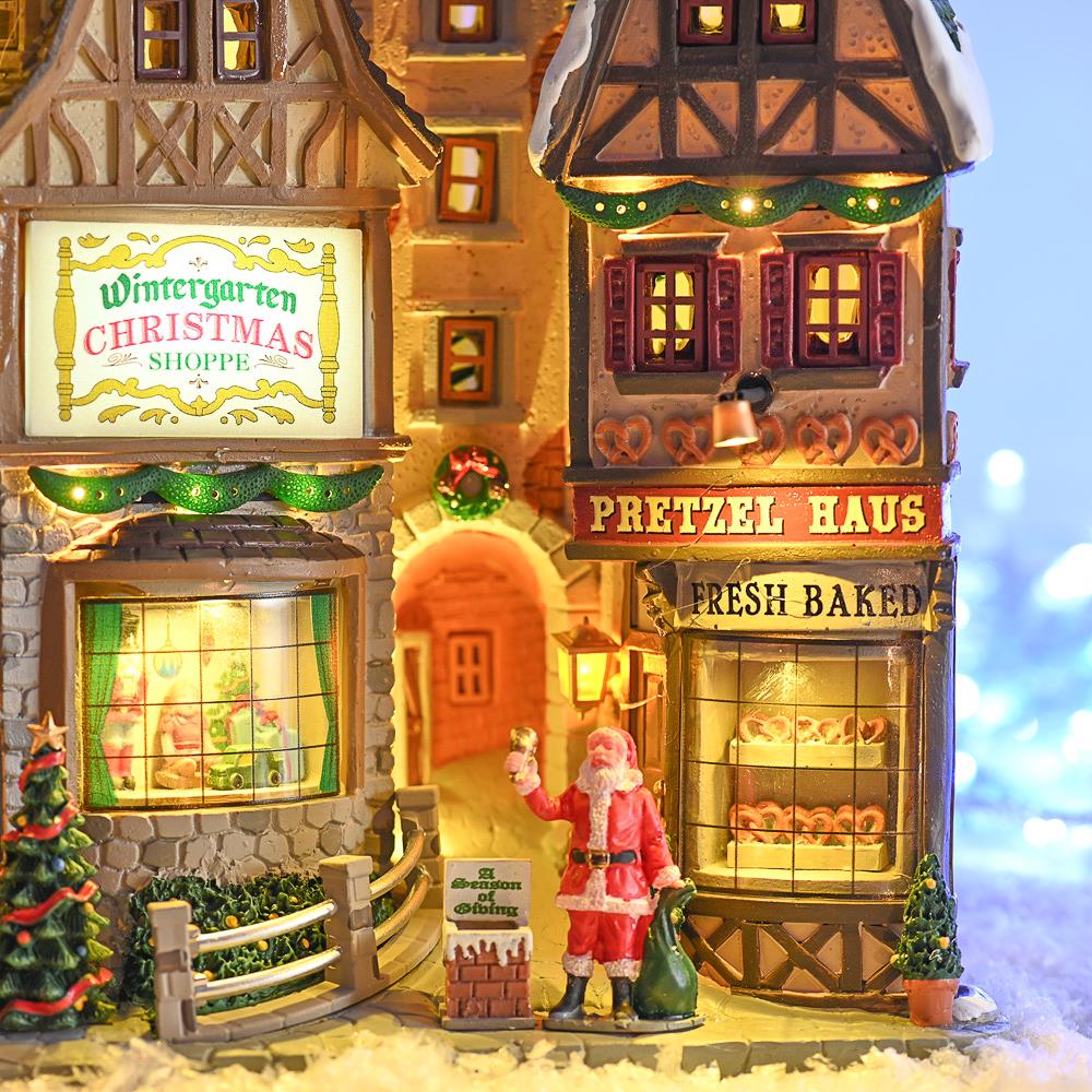 If you're looking for a German Christmas, Wintergarten Lane has everything you need. On the left of this biulding is the Cask & Stein pub, which has three men sitting at the bar, enjoying a beer. In the middle is the Wintergarten Christmas Shoppe, which has all the gifts you need. Tired? On the right, you have Pretzel Haus, where you can enjoy a fresh-baked treat