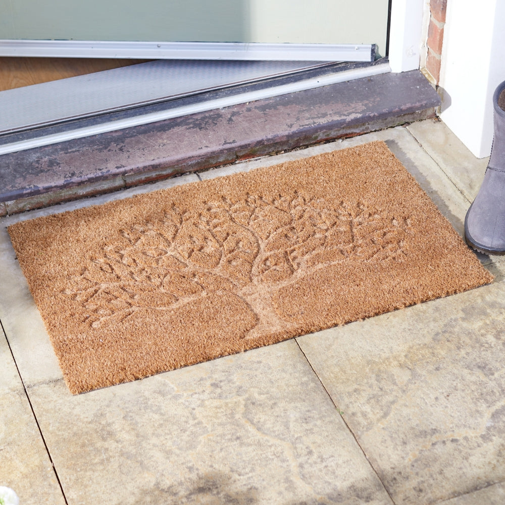 The Tree Decoïr Mat 45 x 75cm is an eco-friendly entrance mat crafted from natural coconut fibre. Its durable coir surface effectively removes mud and dirt from shoes and boots, keeping floors clean while adding a stylish tree-inspired design to your doorway.