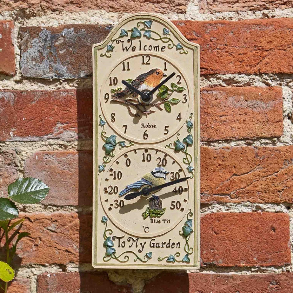 This decorative wall clock and thermometer brings charm and practicality to both indoor and outdoor spaces. Made from weather resistant hand painted polyresin it features clear Arabic numerals, a smooth skip hand movement and an accurate quartz mechanism. The built in Centigrade thermometer offers an easy way to check the temperature while adding a functional touch to garden walls, patios, conservatories and kitchens.