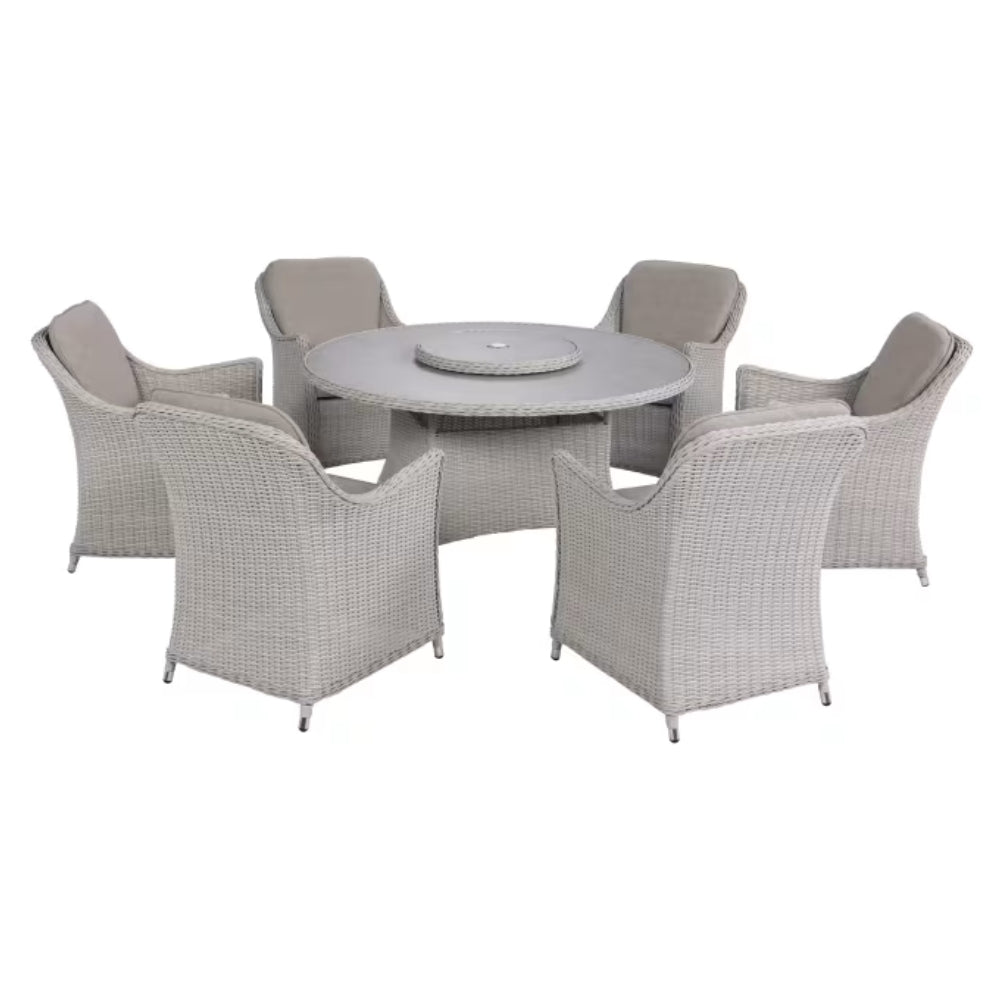 The Antigua 6 Seat Round Dining Set Pearl/Oatmeal is ideal for larger garden gatherings, offering generous seating around a spacious round table. Designed for sociable outdoor dining, this set provides plenty of room for family meals, summer entertaining and relaxed evenings outside.