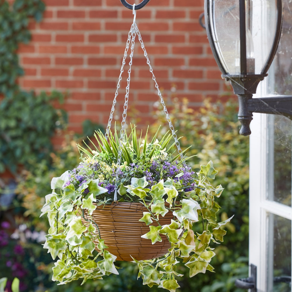 The Faux Décor Lilac Bloom Hanging Basket delivers a fresh natural look with zero maintenance. Featuring a realistic blend of soft lilac flowers, delicate white blooms, spiky green grasses and lush trailing variegated ivy, it creates a full eye catching display that looks beautiful from every angle. Ideal for brightening porches, patios, balconies and seating areas, this ready made basket brings effortless colour to your garden all year round.