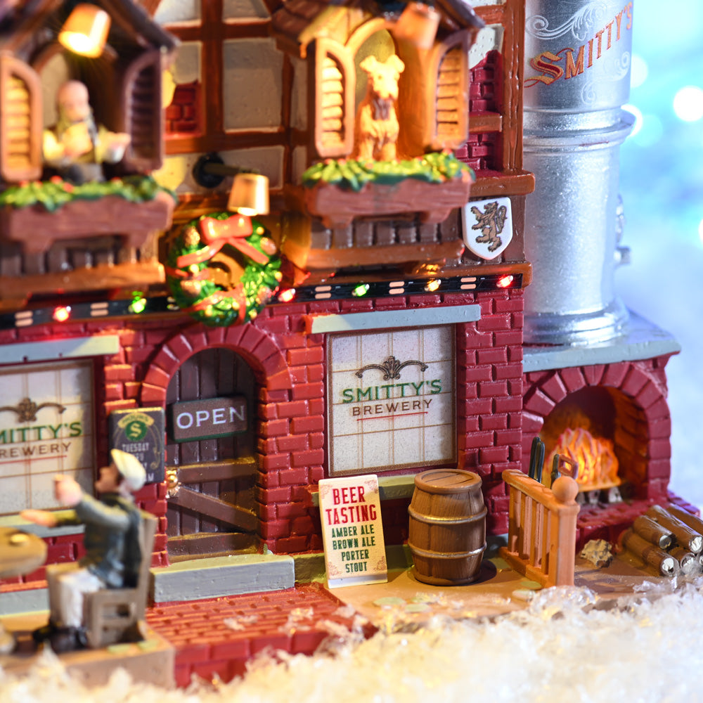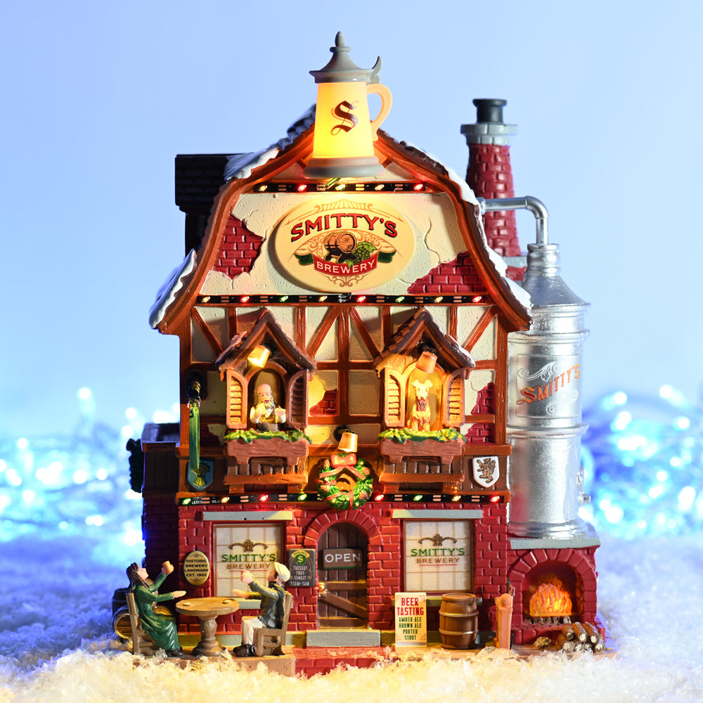 Smitty’s Brewery invites you into a world of rustic warmth and festive camaraderie. This lighted building is made of hand?painted resin and recreates the timeless charm of a traditional brewery where craftsmanship and community come together. The exterior glows softly through LED lighting, controlled by a simple switch. It also features an interior scene visible through its windows, adding layers of story and detail. With dimensions of approximately 25.2 x 20.5 x 15.2 cm, it complements existing village layouts without overwhelming them. The piece is powered by three AA batteries or can be adapted to AC power using a Lemax power adaptor (not included). Released in 2025 as part of the Caddington Village collection, it brings heritage and warmth to any festive display.