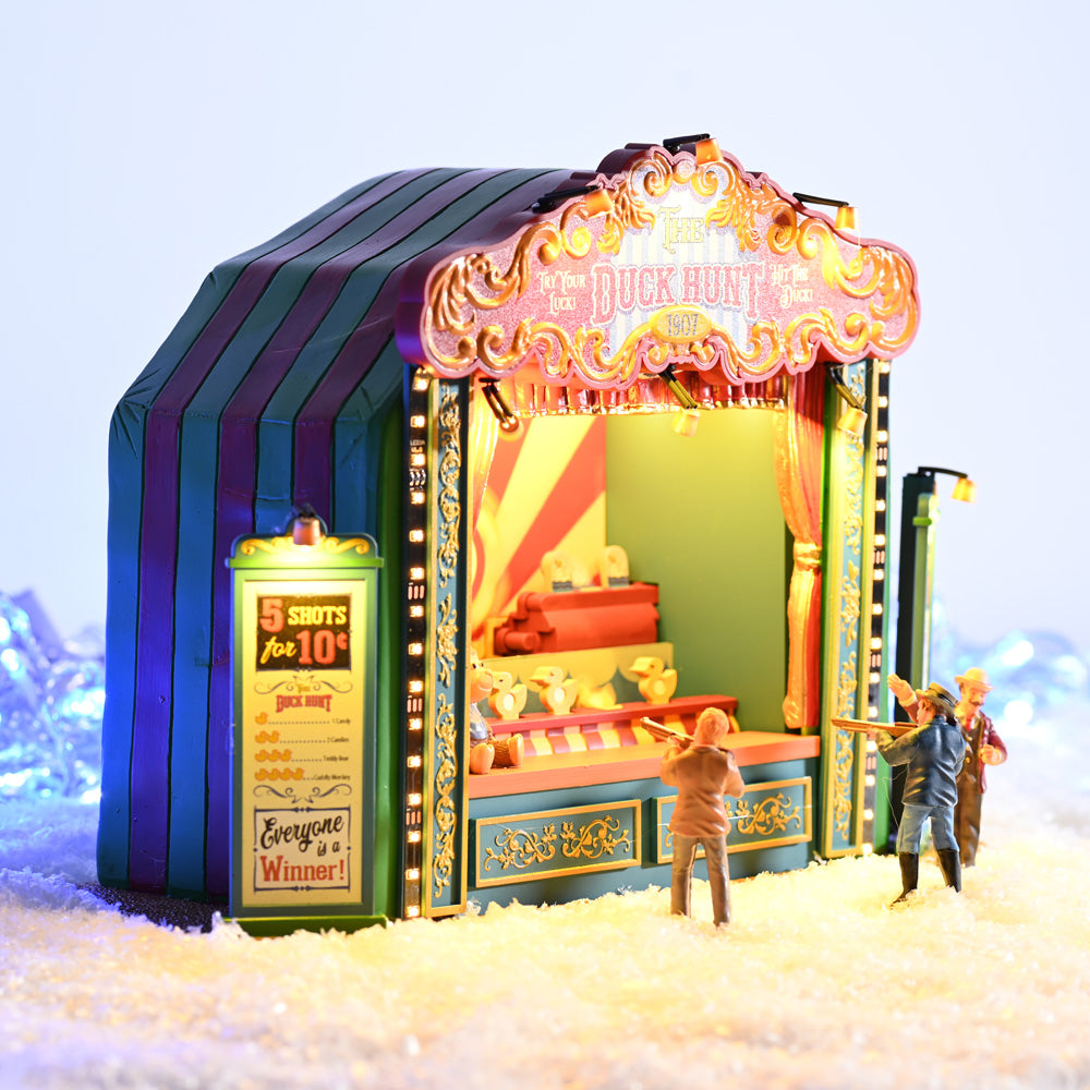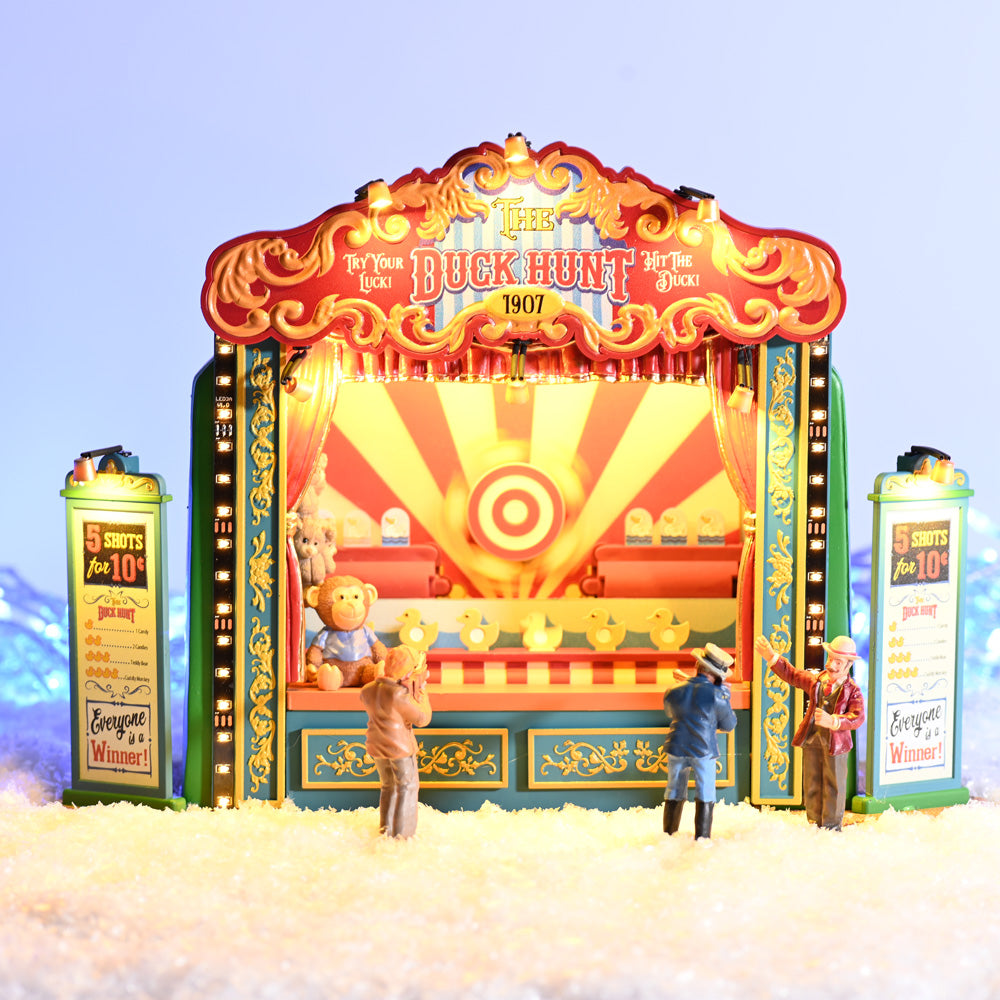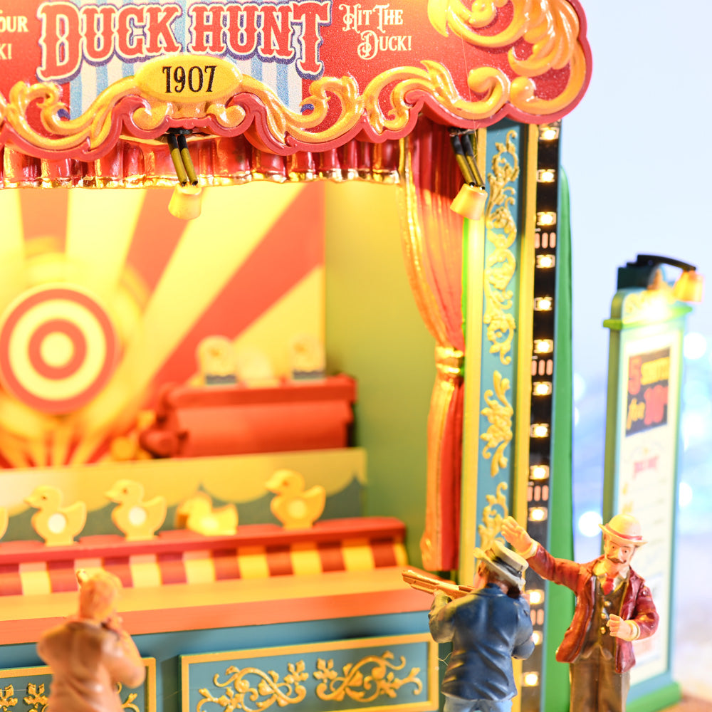 Step into the thrill of a vintage carnival favourite with The Duck Hunt. This animated resin scene evokes the excitement of firing at a parade of moving ducks for the chance to win charming prizes. It combines music, motion and exterior lighting with an intuitive volume and power control. Measuring approximately 20.8 x 30 x 15.8?cm, it delivers lively presence without overwhelming your display. Released in 2025, it includes an adaptor for effortless plug?and?play setup.