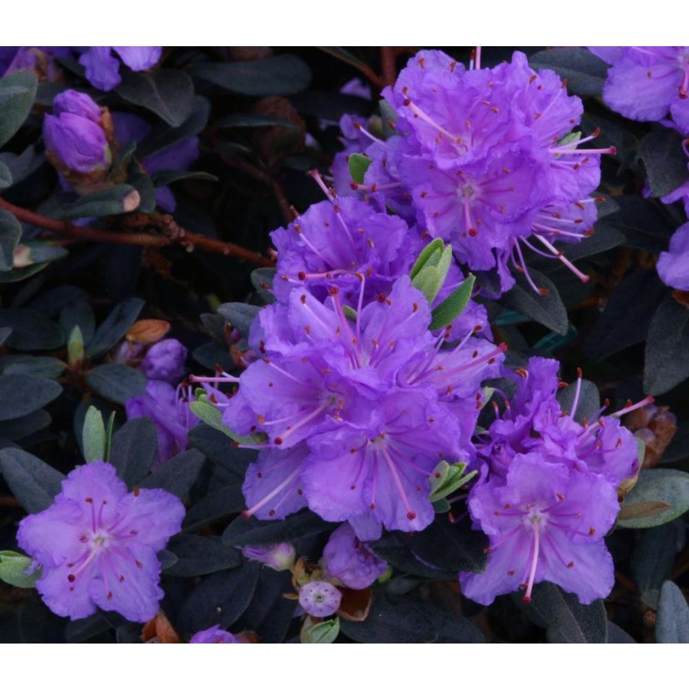 Rhododendron Dwarf Ramapo is a compact, evergreen shrub that grows to be 2-3 feet tall and wide. It has blue-green leaves and produces clusters of violet-blue flowers in the spring. A relatively easy-care shrub that prefers to be planted in well-drained, acidic soil in a partially shaded location.