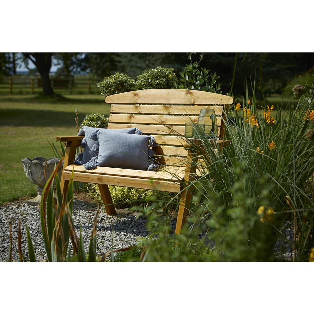 Classic English designed for complete comfort with a curved seat design front and back for comfort. Finished in a warm , traditional wood stain.