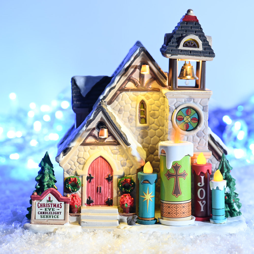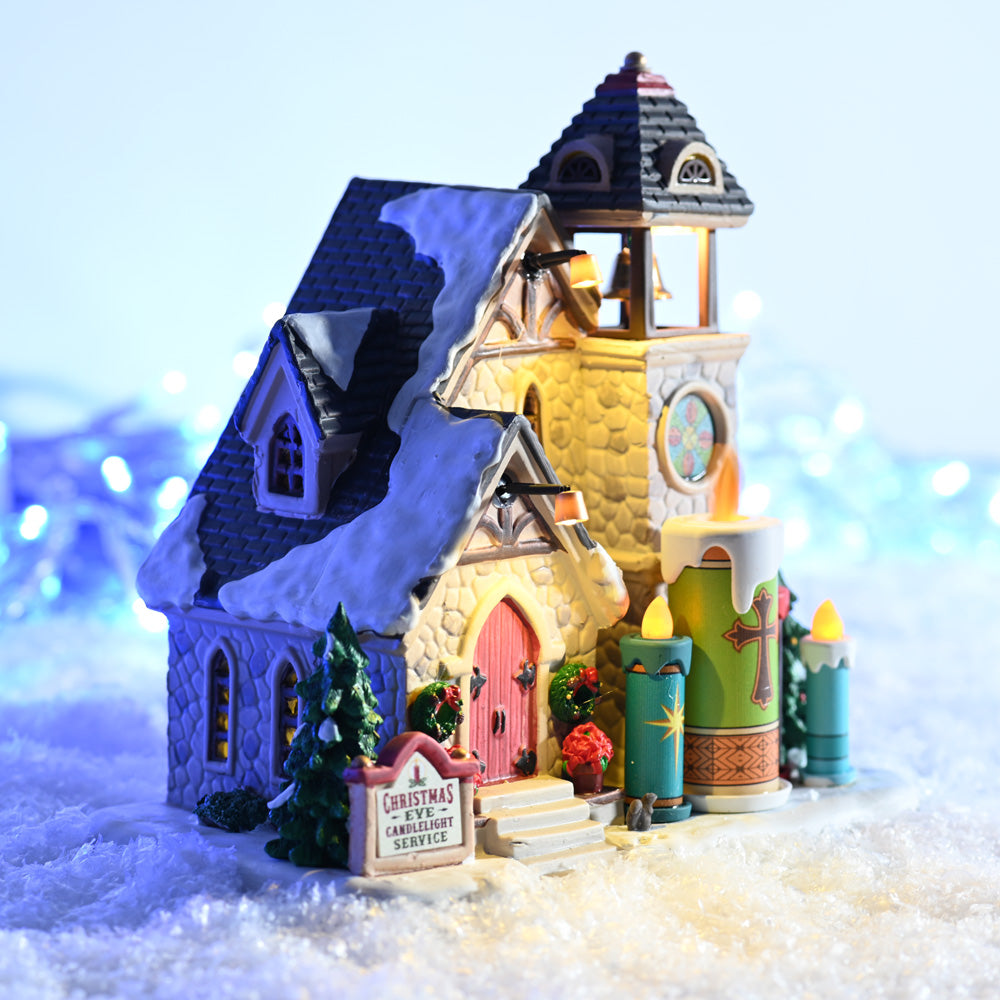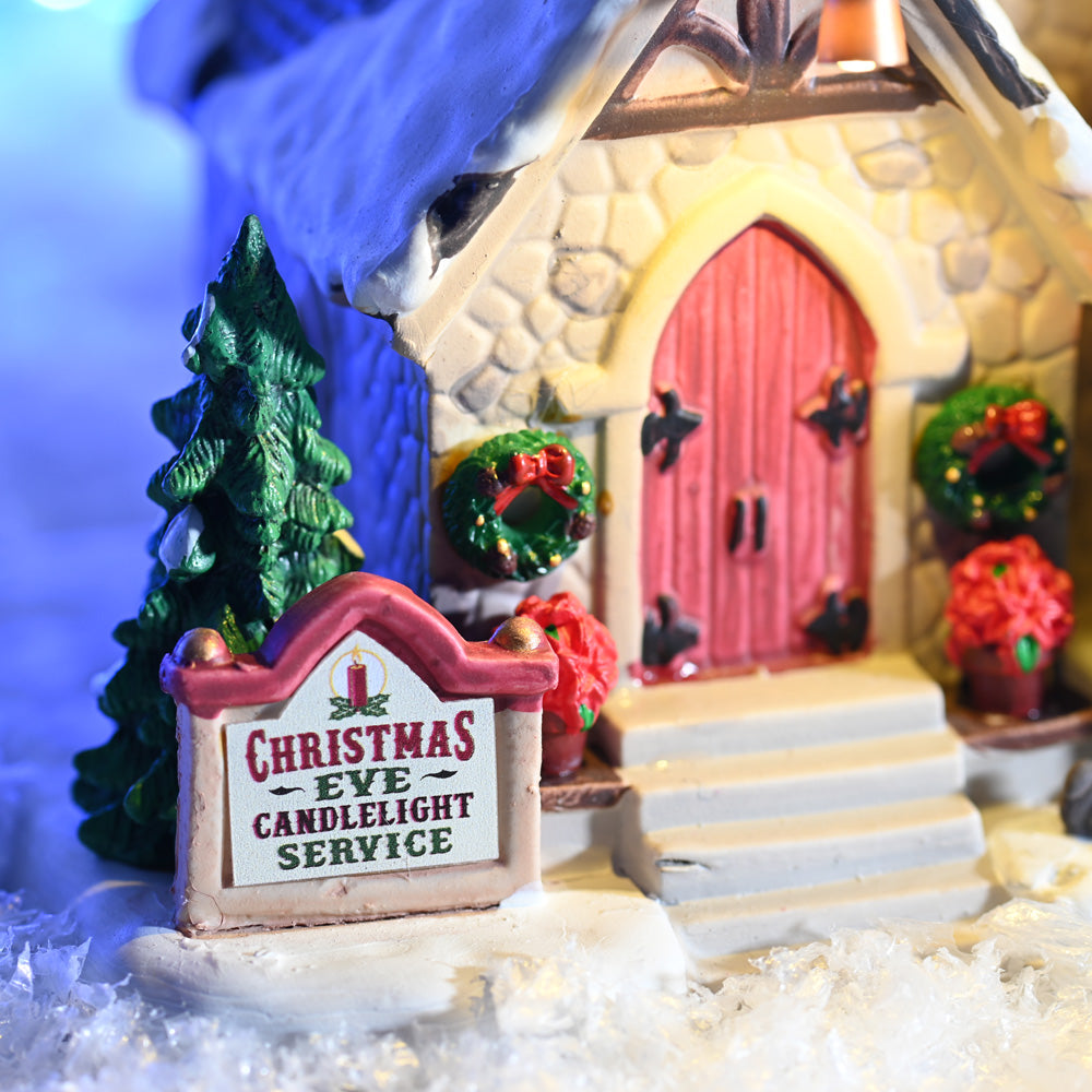 The Lemax Candlelight Church invites the serenity of a festive evening service into your village scene. Crafted from porcelain, it features a quaint church with glowing candles and twinkling Christmas trees at its entrance. Built-in LED lighting softly illuminates the facade via an on/off switch, while the included adaptor ensures immediate display readiness. Measuring approximately 18 x 18 x 12 cm, it is both elegant and compact, fitting nicely into any layout. Released in 2025 as part of the Caddington Village collection, it brings peace, nostalgia and radiant charm to your seasonal display.