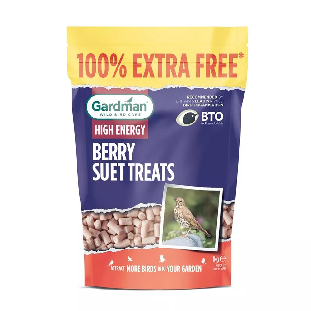 Gardman Berry Suet Treats are high in energy to help fuel birds for longer. Re-sealable packaging helps keep food fresher for longer. This is a great value way to buy suet treats with 100% extra free. Whilst stocks last.
