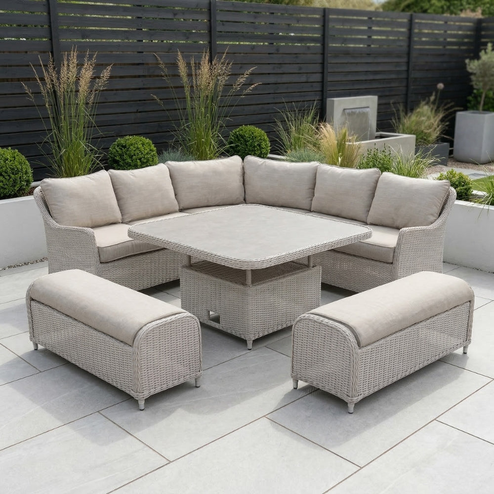The Antigua Corner Casual Set Pearl/Oatmeal is designed for relaxed outdoor living, combining generous seating with a versatile dining height table. Ideal for patios, decking and garden entertaining areas, this corner set offers a comfortable space for everyday lounging as well as casual meals with family and friends.