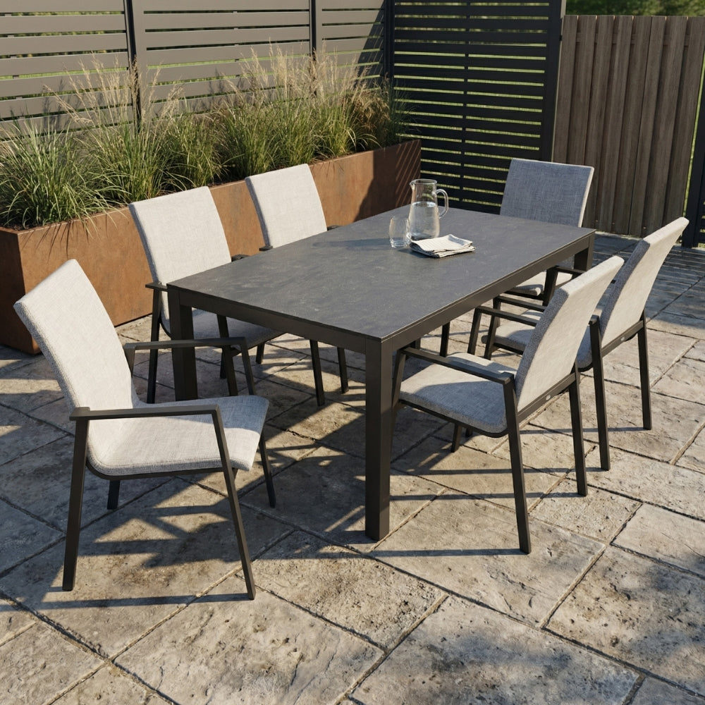 Six stackable aluminium dining chairs complete the set, each designed with padded dove grey texteline seating for comfort and support during long outdoor meals. The stackable design makes storing the chairs simple during winter months, helping keep your outdoor space organised. With its clean modern design and durable materials, the Aylesford dining set provides a stylish and practical solution for everyday garden dining and entertaining.