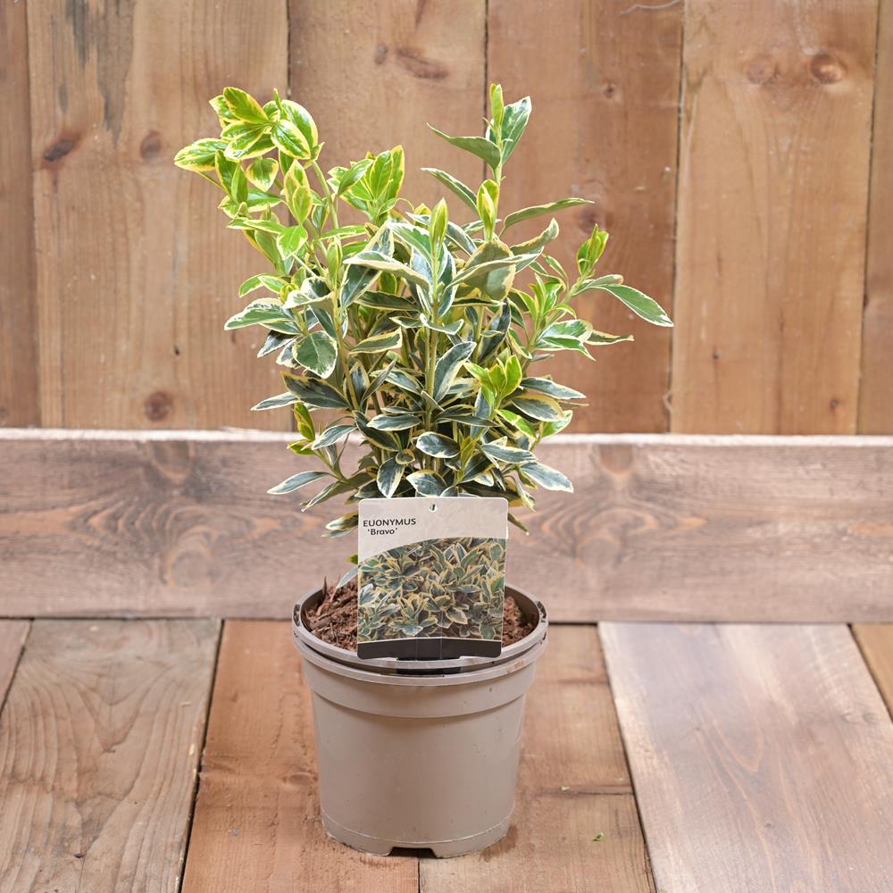 Euonymus Jap. 'Bravo is an upright rounded plant with deep green rounded leaves that have a bold cream edge. Best grown in sun or partial shade in a moist yet well drained soil