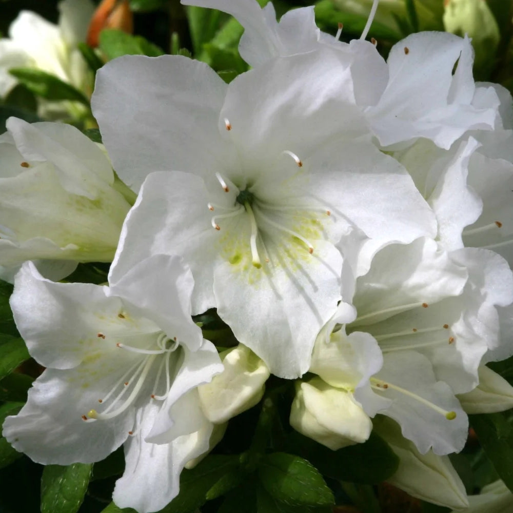Azalea 'Pleasant White' is one of the easiest white evergreen azaleas to grow, producing clean bright flowers from mid May to mid June. Growing to around 100cm, it suits pots, borders and rockeries and offers a tidy compact habit. Evergreen azaleas vary in leaf retention through winter, but all provide strong spring colour. Each pot contains a mature single plant, giving a full established look rather than a pot of small cuttings.