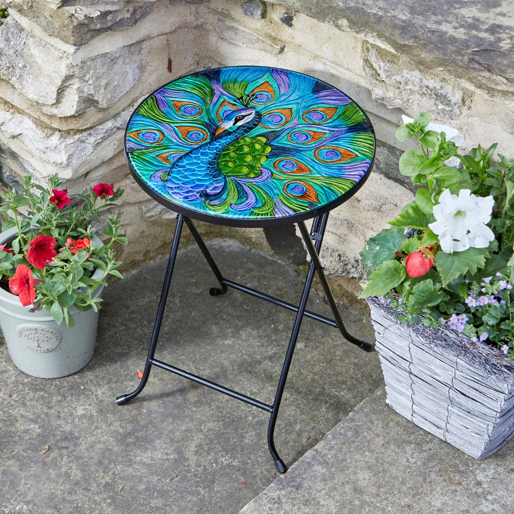 Bring bold colour and elegant detail into your home or garden with the Flamboya Hand Painted Glass Folding Table in a striking peacock design. The vibrant glass top showcases intricate artwork inspired by the beauty of the peacock, making it a standout feature on any patio, balcony or indoor space. Compact and practical, it's perfect for holding drinks, plants or decorative pieces. The foldable metal frame allows for easy storage and movement, making it a versatile addition to any setting. Supplied in a presentation box, it also makes a thoughtful gift.