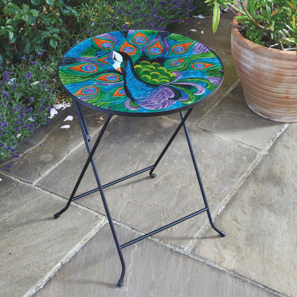 Make more of a statement in your home or garden with the Flamboya Hand Painted Glass Folding Table in a striking peacock design, now in an XL size. The vibrant glass top features intricate artwork inspired by the elegance of the peacock, creating a bold focal point for patios, balconies or indoor spaces. With a larger surface area, it offers more room for drinks, plants or decorative pieces while still remaining practical. The foldable metal frame allows for easy storage and movement, making it a versatile addition to any setting. Supplied in a presentation box, it also makes an eye-catching gift.