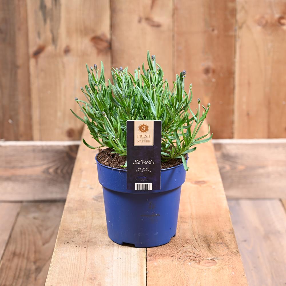 Lavandula Angustifolia Felice is a newer variety of English lavender developed to give a longer flowering time. Producing dense spikes od dark blue-violet flowers throughout the summer.