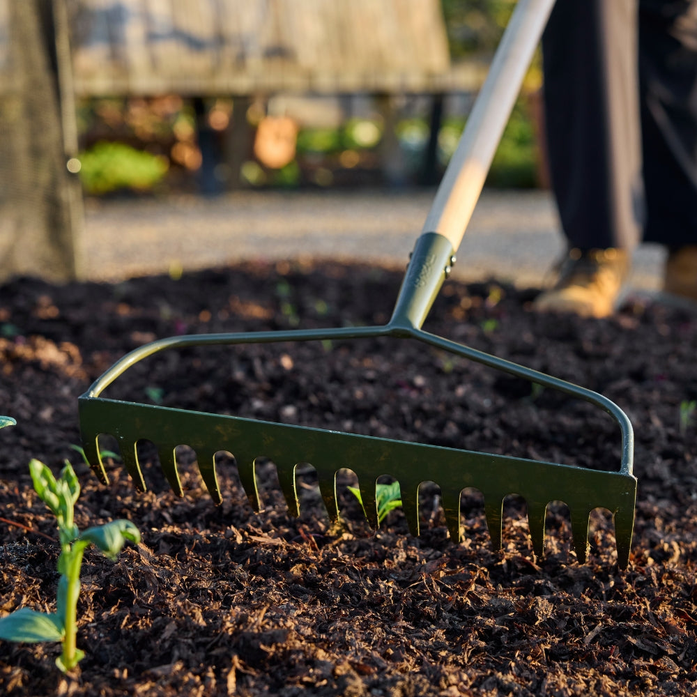 The RHS Endorsed BoronGreen Steel Ground Rake combines boron steel strength with sustainable materials, creating a professional-grade tool for spreading, grading and levelling soil. Its extra-wide head, featuring 14 flat tines ground to a point, makes it easy to work the soil efficiently while creating a smooth, level surface. Ideal for use with soil, bark, gravel, sand or other ground covers, this rake delivers precise, reliable results every time.