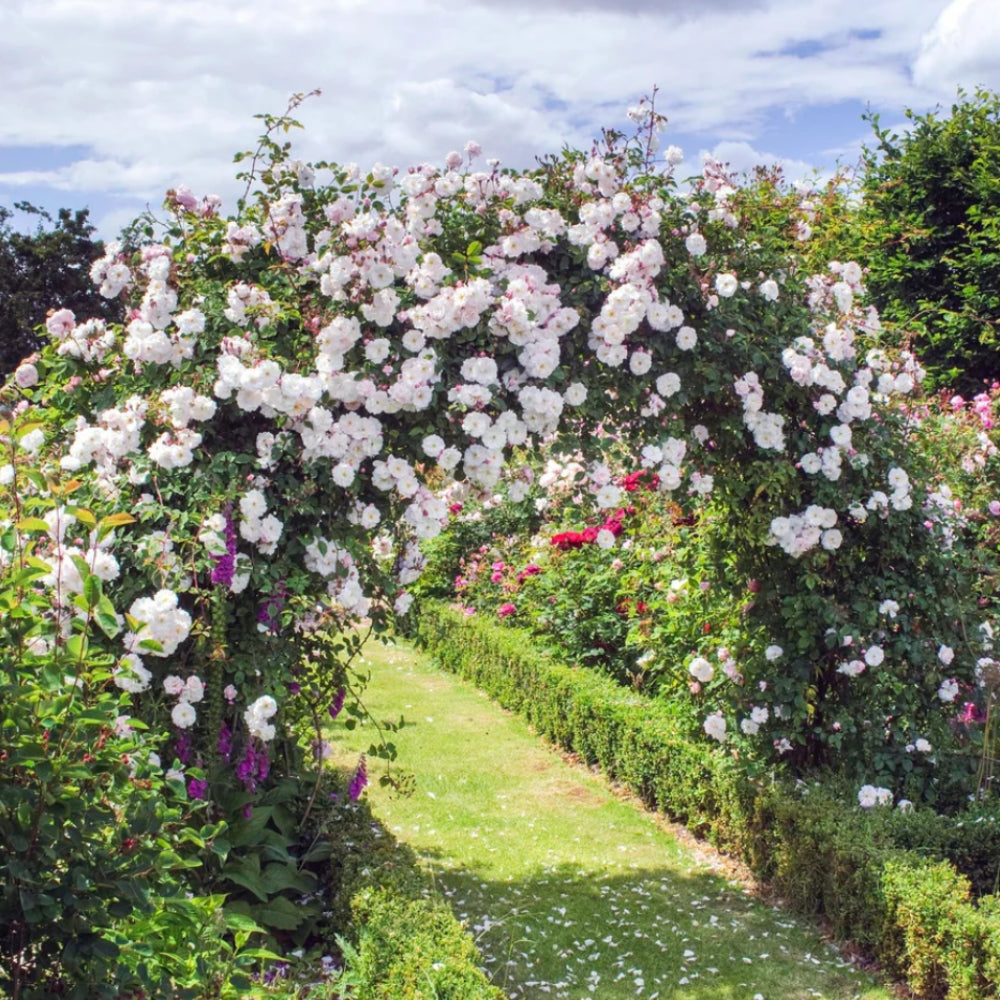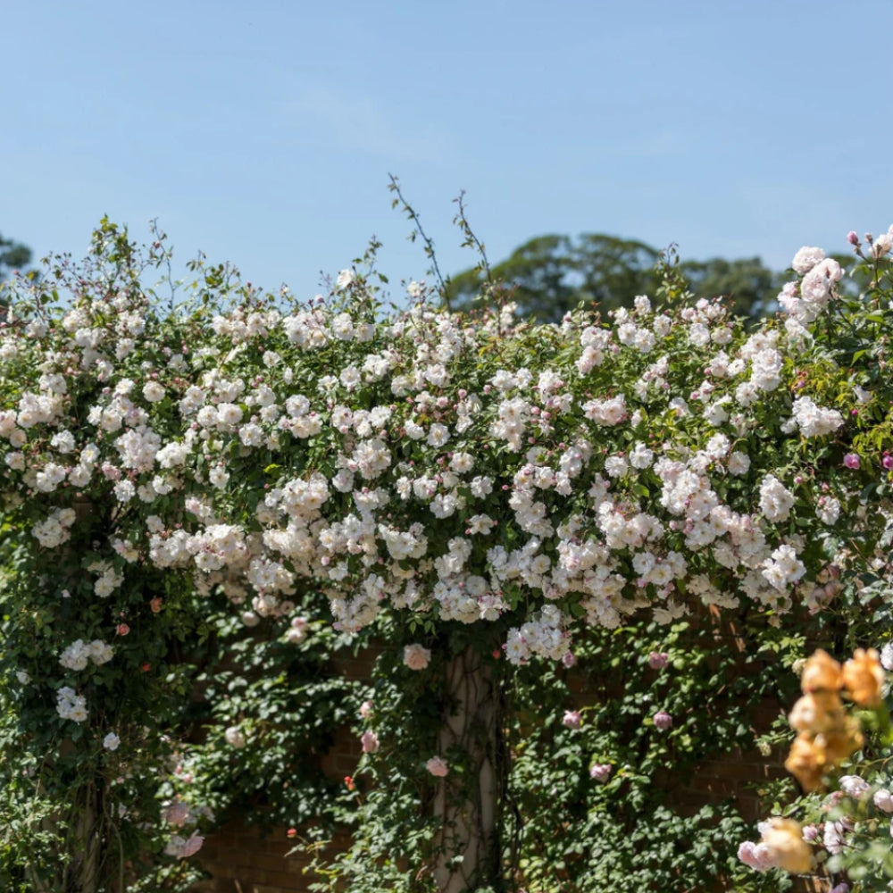 Adélaïde d'Orléans is a graceful rambler with pink buds that open to soft semi double flowers which fade from cream to white. The blooms are held in small sprays that hang lightly from the stems giving a look similar to flowering cherry. The growth is lax and easy to guide which makes it suitable for arches pergolas and small trees. Unlike many ramblers it keeps a fair amount of leaf through winter giving longer interest. First introduced in 1826 it remains a charming choice for adding gentle height and seasonal colour.