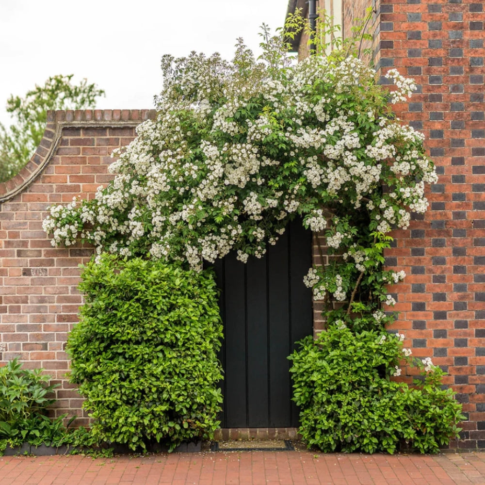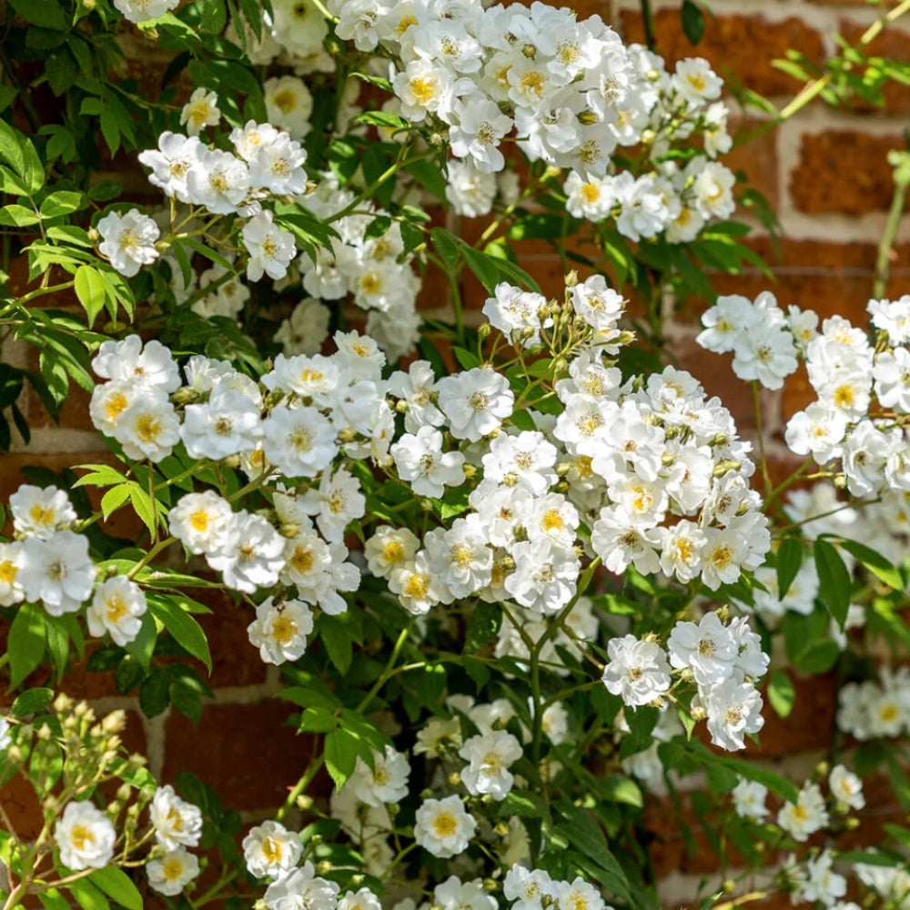 Rambling Rector is a vigorous rambler that produces large heads of small creamy white flowers, fading to pure white as they age. Each bloom has a cluster of golden stamens and a strong musky clove scent. It flowers once in early summer but does so with remarkable abundance, creating a striking display. After flowering it forms masses of small hips that add autumn interest. With its dense twiggy growth and impressive height, it is suited to large structures or for scrambling into tall trees.