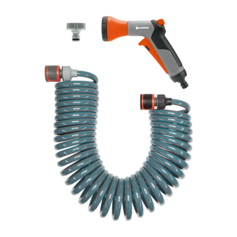 The GARDENA Spiral Hose Set 10 m is the ideal solution for watering plants on balconies, patios, or small gardens. Thanks to its innovative coil design, the hose automatically recoils after use, eliminating the hassle of unrolling and rolling it back up.
