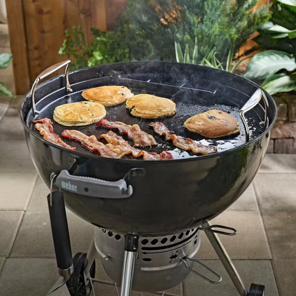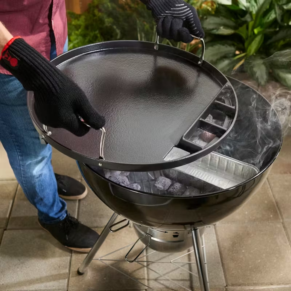 Designed with both performance and practicality in mind, the griddle features a porcelain-enamel coating that ensures a smooth cooking surface and makes cleanup far simpler after use. The round design includes a raised rim to keep oils and juices securely contained, while the integrated rear grease removal slot is designed to work with a large-capacity drip pan (sold separately) for a neat and tidy experience. To ensure safety and ease of use, the griddle is equipped with two sturdy stainless steel handles, allowing you to lower it into or lift it out of the barbecue with total control. Durable enough to handle metal spatulas and tongs, this insert is built to be a long-lasting staple of your charcoal grilling setup.