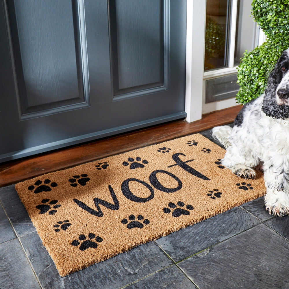 The Woof Decoïr Mat 45 x 75cm is an eco-friendly entrance mat crafted from natural coconut fibre. Its durable coir surface efficiently removes mud and dirt from shoes and boots, keeping floors clean while adding a playful dog-inspired design to your doorway.